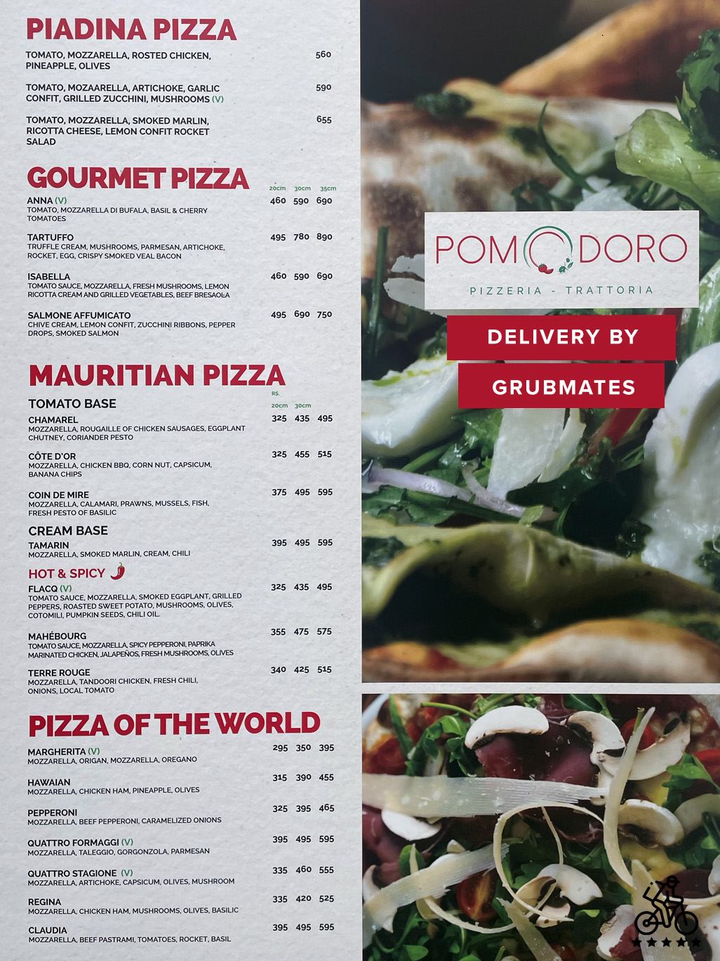 Pomodoro Menu goes below in the photos. However, please note that the menu items and their prices might vary on the order date and time. When ordering via Grubmates, our delivery courier (a grubmate) will confirm item availability, current prices, and cooking time in person at the restaurant during the order.